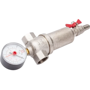 Компактный фильтр для механической очистки воды, позволяющий удалять скопившиеся загрязнения без необходимости вынимать сетчатые вставки (промывной тип). В конструкции предусмотрены два фильтрующих элемента из нержавеющей стали, расположенных один внутри другого. Размер ячеек у первичной сетки составляет 1000 мкм, у вторичной — 250 мкм. Обе сетки выполнены из нержавеющей стали и объединены в сменный фильтроэлемент VT.0117.N, который можно приобрести отдельно. Корпус и колба изготовлены из латуни марки CW617N (соответствует европейскому стандарту EN 12165) с никелевым покрытием. В устройстве предусмотрен дренажный шаровой кран со штуцером для подключения шланга и манометр для контроля степени загрязнения сеток. Монтаж фильтра осуществляется в вертикальном положении колбой вниз, с внутренней резьбой на присоединениях.