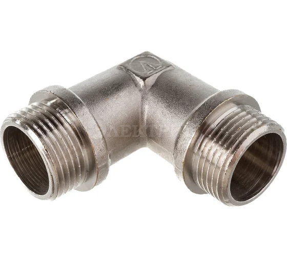 Угловой латунный никелированный фитинг. Резьба - наружная/наружная, цилиндрическая трубная по ГОСТу 6357 (ISO 228, EN 10226).