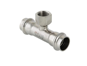Двухраструбный пресс-тройник с внутренней резьбой, изготовленный из нержавеющей стали, предназначен для соединения тонкостенных стальных труб с резьбовыми элементами в системах водоснабжения, отопления и других инженерных или технологических установках. Фитинг рассчитан на работу при максимальной температуре до 120 °С и номинальном давлении 16 бар.