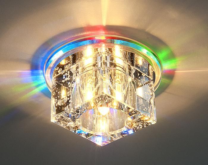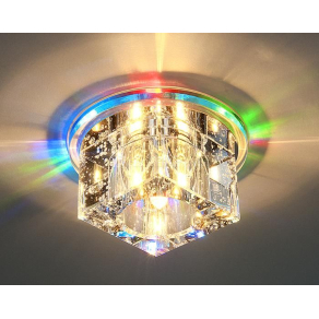 В прозрачном основании светильника расположена плавно переливающаяся всеми цветами светодиодная подсветка. Плафон светильника выполнен в виде стеклянного куба. Светильник подходит для монтажа в натяжные, реечные, гипсокартонные потолки. Светодиодная подсветка может быть подключена отдельно от галогенной лампы.