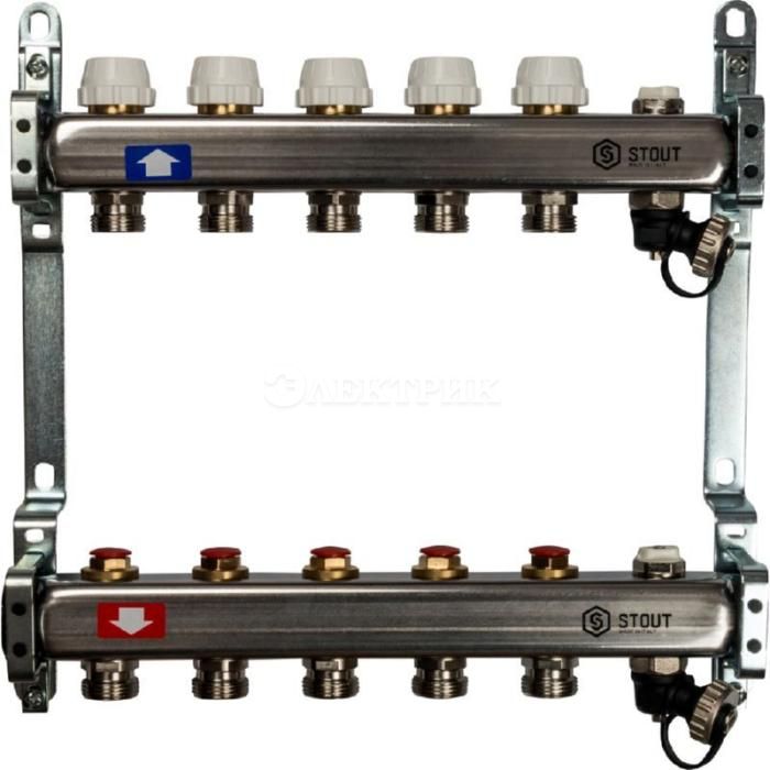 SMS-0932-000005 STOUT Коллектор из нержавеющей стали без расходомеров, с клапаном вып. воздуха и сливом 5 вых. от STOUT - Коллекторные группы - купить в магазине Электрик.