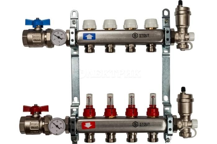 SMS 0907 000004 STOUT Коллектор из нержавеющей стали в сборе с расходомерами 4 вых. от STOUT - Коллекторные группы - купить в магазине Электрик.