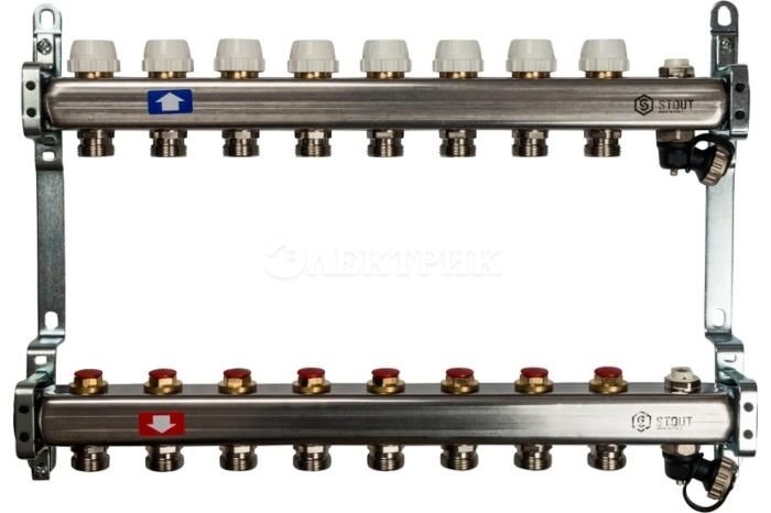 SMS-0932-000008 STOUT Коллектор из нержавеющей стали без расходомеров, с клапаном вып. воздуха и сливом 8 вых. от STOUT - Коллекторные группы - купить в магазине Электрик.