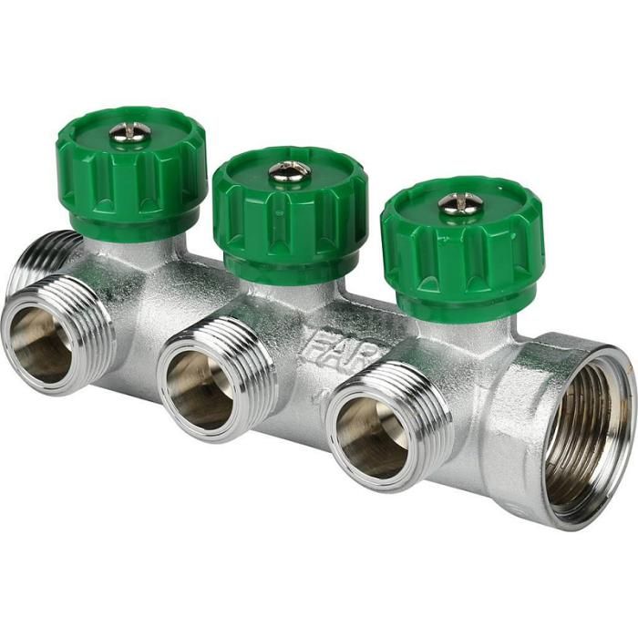 FK 3822 134TP FAR Коллектор распределительный 1", проходной, хромированный, 3 отвода 3/4" плоское уплотнение от FAR - Коллекторы для систем водоснабжения - купить в магазине Электрик.